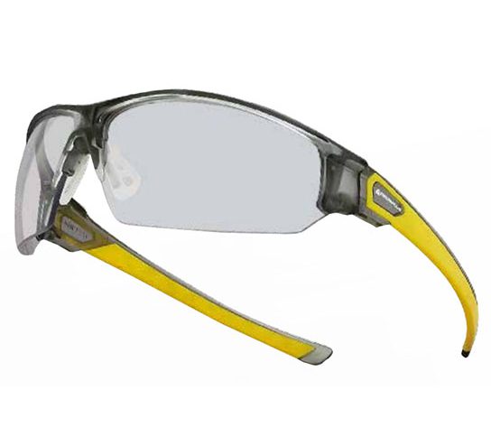 運動款PC防護眼鏡,PC/TPR復合雙材料鏡腿,黃黑高對比度炫酷配色,“D-PAD”獨特創新鼻梁架,高度貼合面部自由調節高度,可適用于任何臉型。隨眼鏡附贈便攜袋一個。