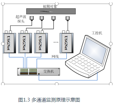 USGNet還提供了功能豐富的二次開發工具包,可自主開發應用軟件,展現個性化應力測量需求。圖1.2和圖1.3分別是單通道和多通道組合檢測連接示意圖。