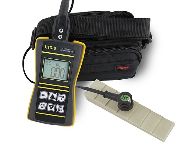 UTG-8能夠以±0.01 mm的精度測量各種材料的厚度。它用于各種行業中,用于測量罐,管道,車身零件,薄板等的壁厚,包括帶有腐蝕表面且單側可接近受控材料的壁厚。