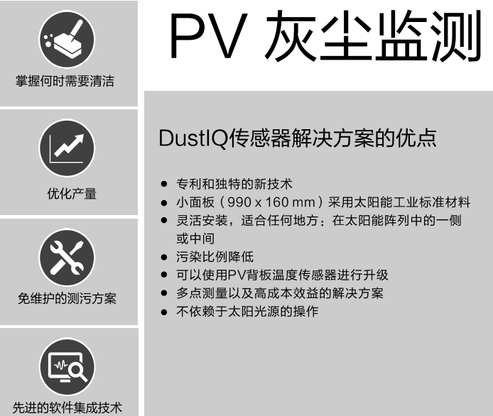 DustIQ使用Kipp & Zonen的新型創新光學灰塵測量(OSM)技術監測光伏面板上的積灰造成的光傳輸損失。 它沒有移動部件,也不需借助陽光進行測量。