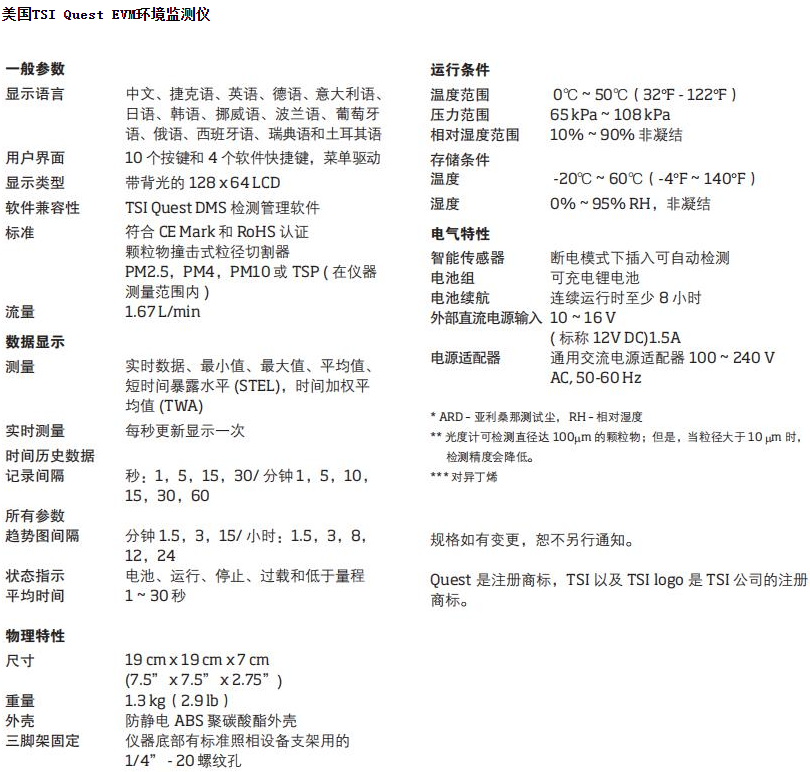 美國TSI EVM環境監測儀 相關參數:
