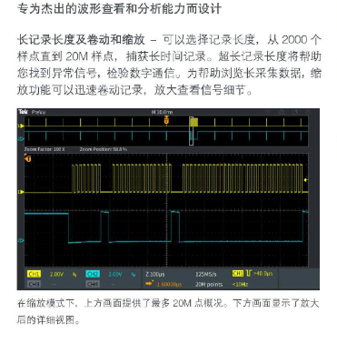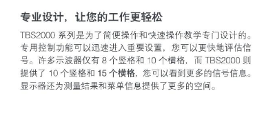 如果能查看更多信號,您就會更快發現異常。TBS2000數字存儲示波器有令人印象深刻的9”WVGA顯示器和15個水平分度(同類產品中最多),不僅可幫助您查看大圖像,還可提供更清晰的圖像。 另外,其20M點記錄長度可讓您捕獲具有更高時序分辨率的長時間窗口。