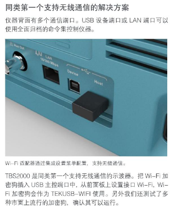 TBS2000是第一款通過USB Wi-Fi加密狗提供Wi-Fi支持的示波器。 其還具有2個USB主控端口和1個滿足LXI標準的100-BaseT以太網端口,使與您的實驗室合作伙伴或在全球范圍內共享測量和協作變得很容易。 另外,其包含的軟件可讓您輕松連接到您的PC,以抓取屏幕圖像和分析數據。