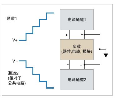如果想為雙極模擬電路供電,可以把 Series2230G 電源的通道 1 和通道 2、 30V和60V通道連接起來,為正電路 和負(fù)電路供電。電源擁有跟蹤模式,可 以使用一個(gè)控制操作,同時(shí)改變兩臺(tái)電 源的輸出。在電壓變化時(shí),跟蹤的兩條 通道的幅度可以一起變化,也可以按用 戶規(guī)定的比率變化。因此,可以簡(jiǎn)便地 在指定電壓工作范圍內(nèi)測(cè)試雙極電路、 模塊或器件。