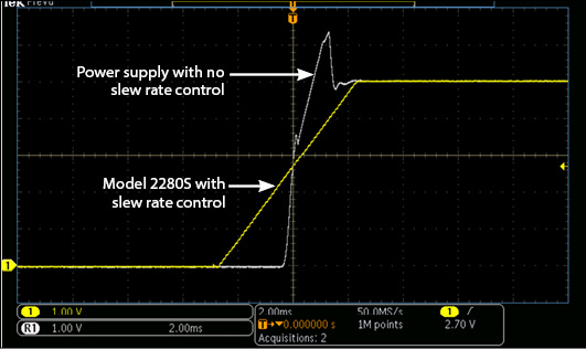 您的設備或系統是否在高涌入電流下工作?2280S系列 電源允許對電壓輸出上升時間進行編程,從而減緩電壓斜線 上升,避免電壓過沖,因為電壓過沖有可能損壞待測器件。 此外,還可以對電壓下降時間進行控制,以避免輸出電壓的 快速下降。電壓上升和下降時間,可以設置為10V/s或100V/s。 對于微小的電壓變化,可以將上升和下降時間設置為1000V/s。