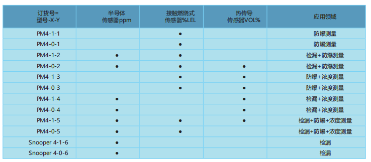 為方便訂貨,我們給出下面訂貨規則是:主機型號-X-Y,其中主機型號=PM4 或者為Snooper 4; X=1 表示泵吸, X=0 表示擴散; Y=1表示%LEL量程,Y=2表示PPM+ %LEL量程, Y=3表示LEL+ VOL%量程, Y=4表示PM+VOL%量程, Y=5表示PPM+ %LEL+ VOL%量程,Y=6表示PPM單量程檢漏。