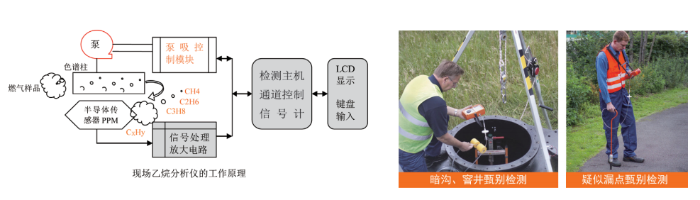 為解決城市燃?xì)庑孤z測(cè)時(shí)地下沼氣的干擾,德國(guó)豎威公司專門研發(fā)了智能乙烷辨識(shí)儀VARIOTEC EGA,利用地下沼氣中不含有乙烷(C2H6)的特點(diǎn),通過(guò)氣相色譜分析來(lái)實(shí)現(xiàn)對(duì)天然氣和沼氣的區(qū)分。