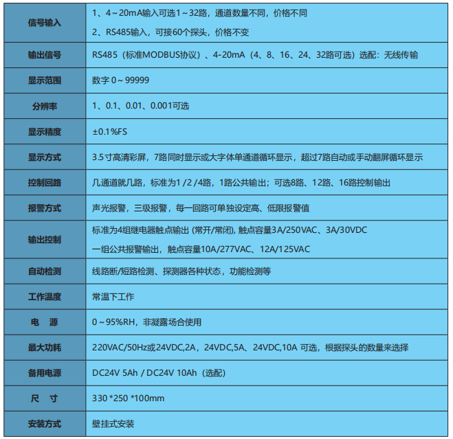 我公司設計的主機報警控制器H-110模塊化結構設計,標準通道為1路(最多32路)4-20mA輸入信號,同時可接255路RS485輸入信號,更多通道輸入信號可訂做,控制器與控制器之間可以互相通訊。并且4-20mA與RS485可同時輸入;數據輸出支持標準MODBUS協議,同時可選配:8路4-20mA輸出、以太網模塊、支持云端的上位機電腦監控軟件。