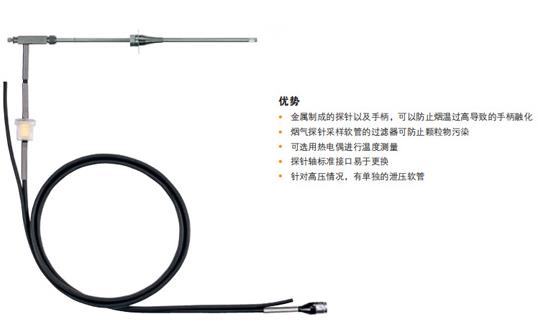 在固定工業(yè)發(fā)動(dòng)機(jī)(如燃?xì)?柴油發(fā)動(dòng)機(jī))上進(jìn)行煙氣測(cè)量時(shí),煙氣探針性能卓越。由于它完全由金屬制成,因此可防止手柄因煙氣管道熱輻射而融化。煙氣探針可用于煙溫高達(dá)+1000 °C的工況。測(cè)量也可以在高壓下進(jìn)行(最高可達(dá)100 mbar)。煙氣探針的采樣軟管內(nèi)有一個(gè)附加的過(guò)濾器,可以防止顆粒物污染。