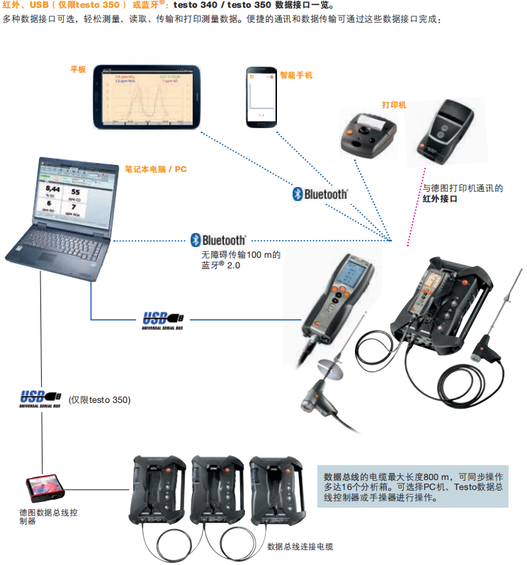 如果采樣現(xiàn)場(chǎng)和調(diào)試現(xiàn)場(chǎng)之間的距離較遠(yuǎn),可通過(guò)Testo數(shù)據(jù)總線電纜或藍(lán)牙?實(shí)現(xiàn)手操器和分析箱之間的連接。