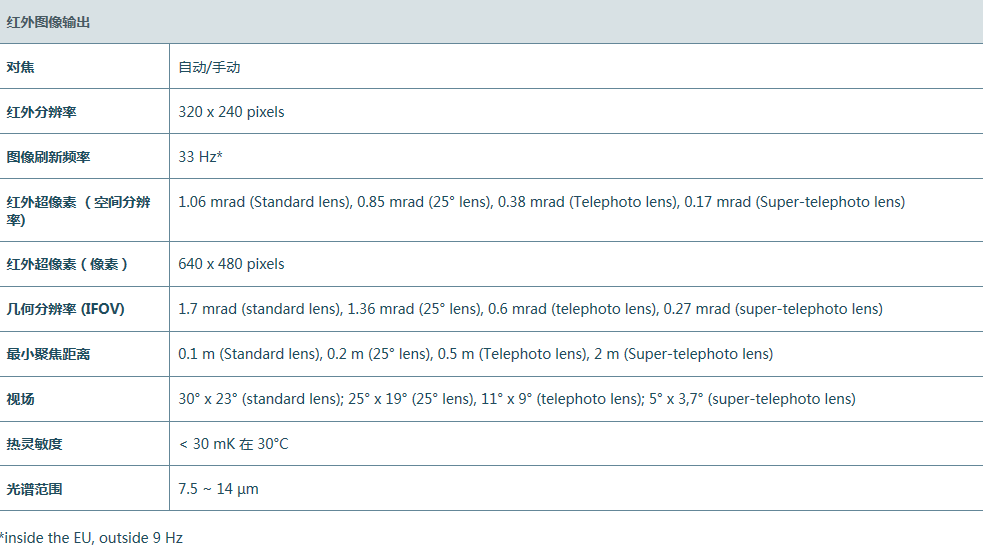 紅外分辨率 320 × 240 像素;采用SuperResolution紅外超像素技術后,可提升至 640 × 480像素;熱靈敏度< 30 mK