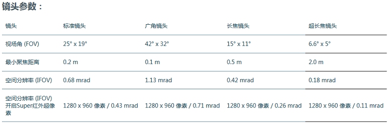 可選配4種鏡頭,滿足不同測量需求:標準鏡頭(25° x 19°),廣角鏡頭(42° x 32°),長焦鏡頭(15° x 11°),超長焦鏡頭(6.6° x 5°)