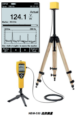 EHP-50F 所有的測量功能都可以通過 NBM-550 遠(yuǎn)程連接控制實現(xiàn),EHP 與 NBM-550 采用光纖(POF 雙工)方式進行連接,NBM 用于顯示 EHP 傳輸?shù)臏y量結(jié)果。對于比較惡劣的環(huán)境和強日光環(huán)境,NBM 相較于 PC 遠(yuǎn)控更有優(yōu)勢。測量數(shù)據(jù)保存在 NBM 中,并可利用 NBM-TS PC 軟件進行評估和管理。除了測量低頻場強,這種解決方案對于需要測量射頻場強的用戶來說也是一種理想的選擇。