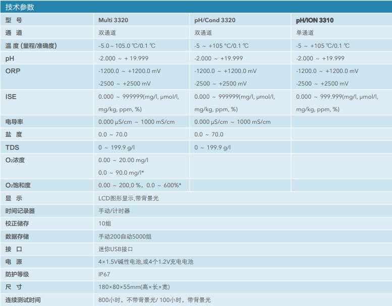 賽萊默XYLEM ProfiLine 便攜pH/ORP/電導(dǎo)率/溶解氧/ISE離子濃度多參數(shù)分析儀產(chǎn)品技術(shù)參數(shù):