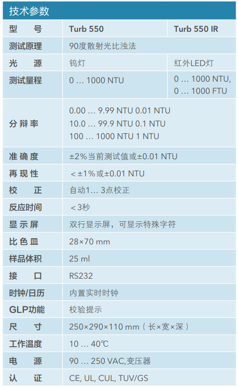 賽萊默XYLEM實驗室濁度分析儀 Turb 550(IR) 產品技術參數:
