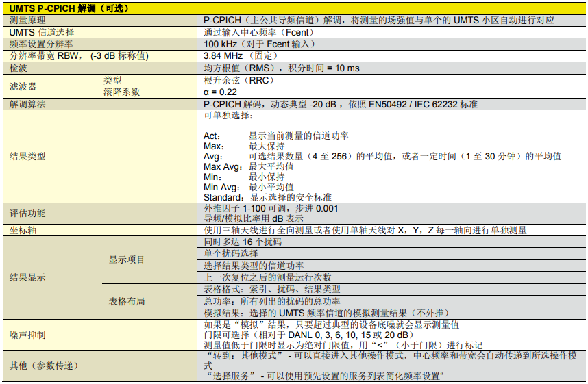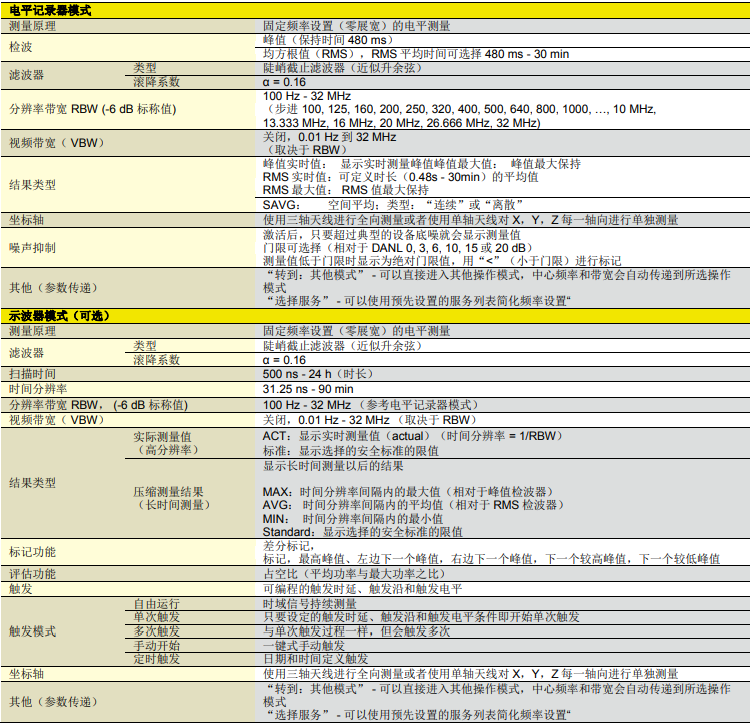 工作模式 頻譜分析、安全評(píng)估、電平記錄器、示波器(可選)、UMTS P-CPICH解調(diào)(可選)、LTE(可選)