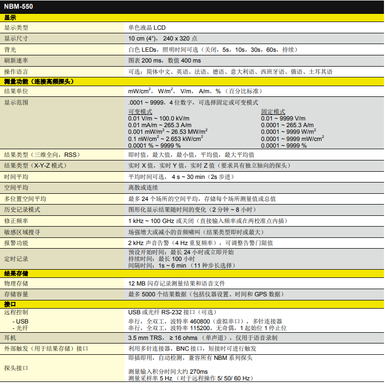 德國NARDA NBM-550超寬頻電磁輻射分析儀產品技術規格: