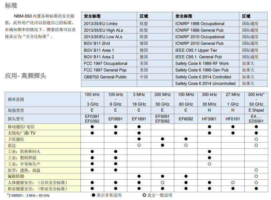 標準采用:當使用計權探頭測量時,通過簡單地設置頻率并選擇 NBM-550 內置的標準(如 ICNIRP 標準),就可得到計權測量結果。如果場強來源主要是已知的某個單一頻率,這種評估非常有用。即使使用普通探頭進行測量,也可以顯示相對于標準限值的百分比結果。