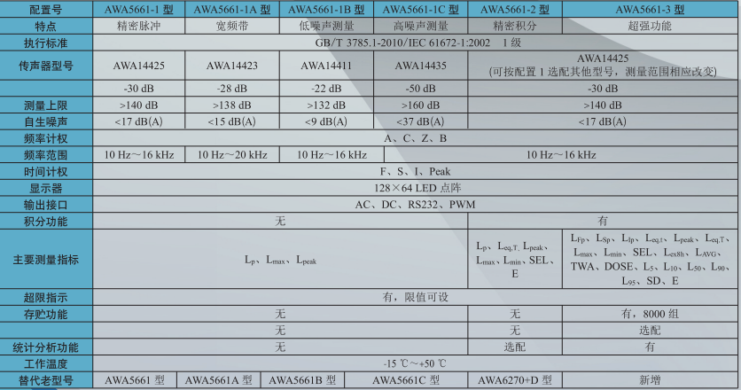 由于AWA5661型模塊化設計,配置按需選取,主要技術性能也有差異,詳情見下表: