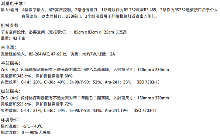 緊湊的多功能的污染監測儀用于輻射防護領域,同時進行手部手背腳部α、β/γ測量,可移動的手背探頭可用于衣物污染測量??蛇x配個人編碼卡和讀卡器進行人員身份識別。