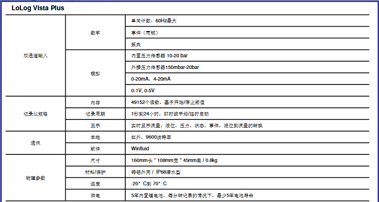 有著先進配置和本地顯示的Vista?Plus是一種手動的記錄儀,提供了多輸入兼容性和PDA/PC軟件兼容性。它還可以通過Winfluid軟件編程一個轉換表格來顯示轉換數據,比如從深度到流量。