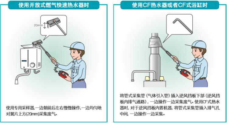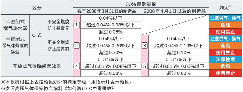 判定名人是一氧化碳檢測儀,測量氣體燃燒器的燃燒廢氣中的一氧化碳 濃度, 根據(jù)高壓氣體保安協(xié)會推薦的判定基準(zhǔn)(參照下述內(nèi)容), 依據(jù)測量結(jié) 果簡易判定可否使用燃燒器。
