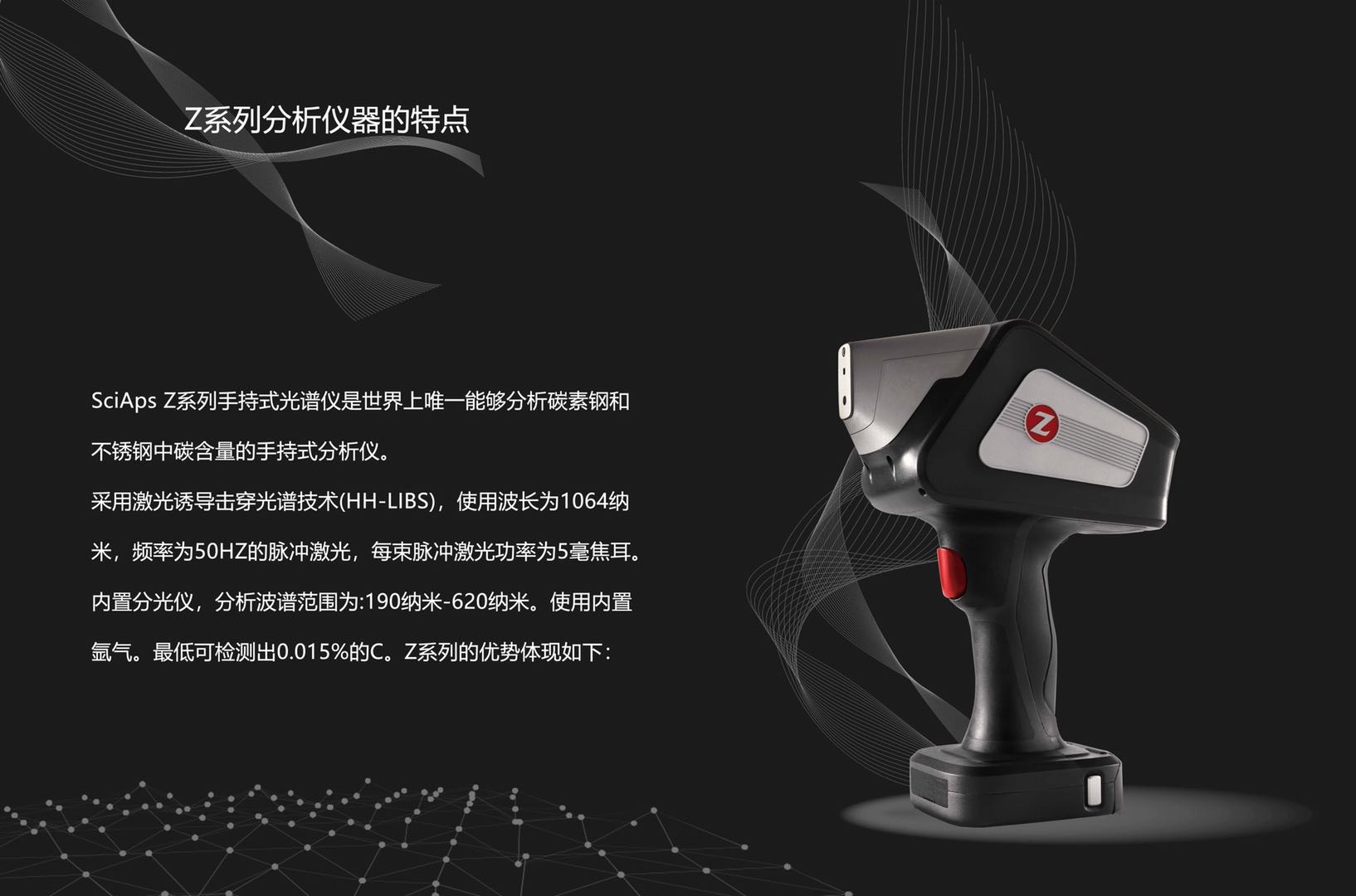 Z-200 C+ 是世界上唯一能夠分析碳素鋼和不銹鋼中碳含量的手持式分析儀。 Z-200 C+ 采用激光誘導擊穿光譜技術(HH-LIBS),使用波長為1064納米,頻率為50HZ的脈沖激光,,每束脈沖激光功率為5.5毫焦耳。內置分光儀,分析波譜范圍為:190納米-620納米。使用內置氬氣。最低可檢測出0.015%的C。