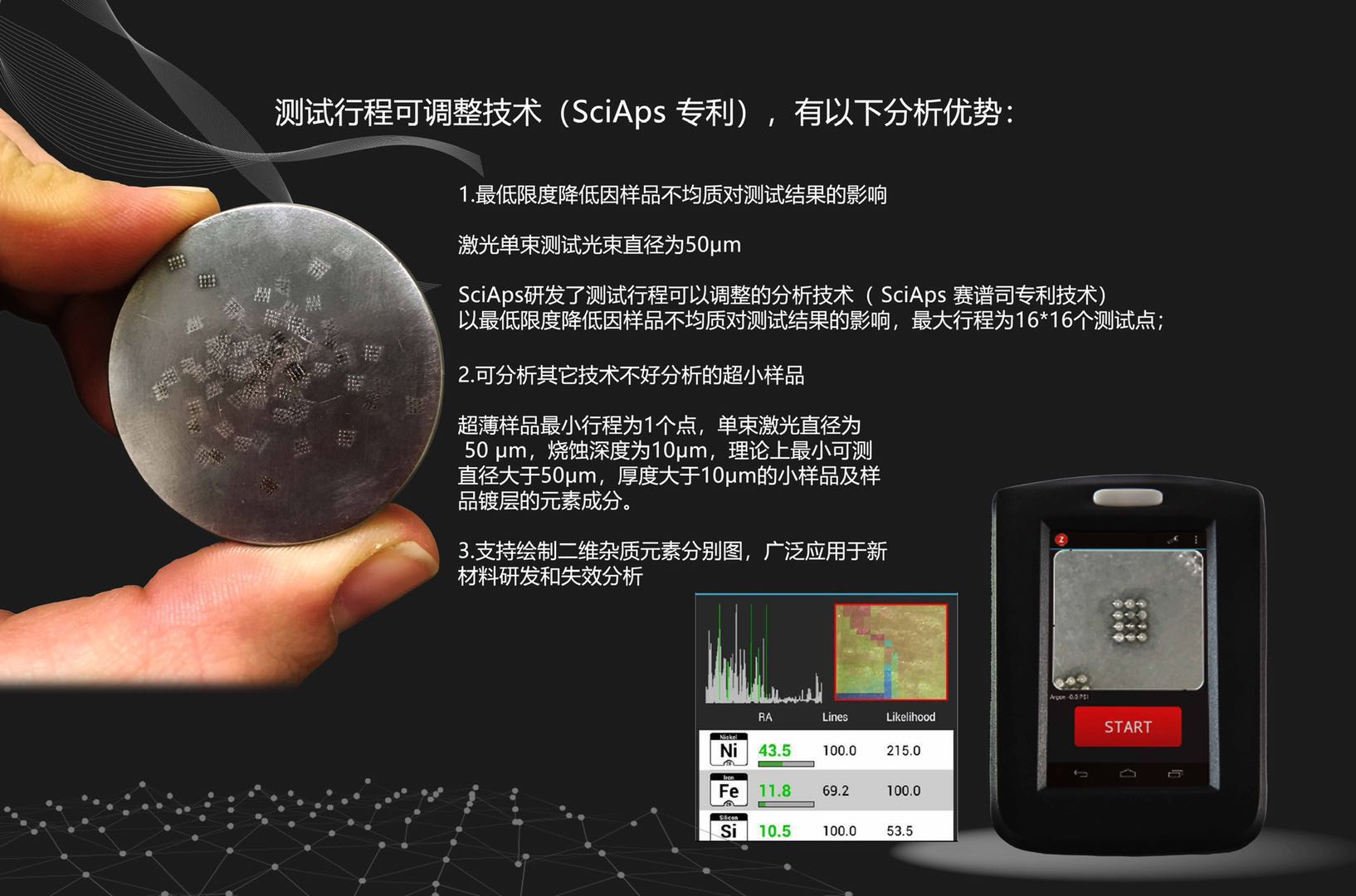 激光合金分析儀能測所有的合金,而不僅僅是鋁合金。 Sciaps使用最好的激光技術,能在十億分之一秒的時間內用高能量(5-6兆焦耳/脈沖,50赫茲)激發的樣品以產生十億瓦功率密度-這是在耐火合金上也能產生很好的等離子體光譜的原因。